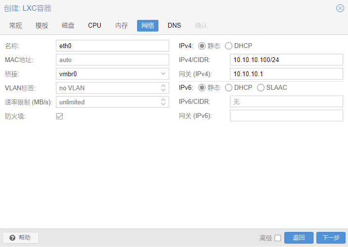 10.10.10.100/24(建议内网 IP 最后一位与 CT ID 一致,这里必须有一个 /24,虽然没卵用) - 网关:
